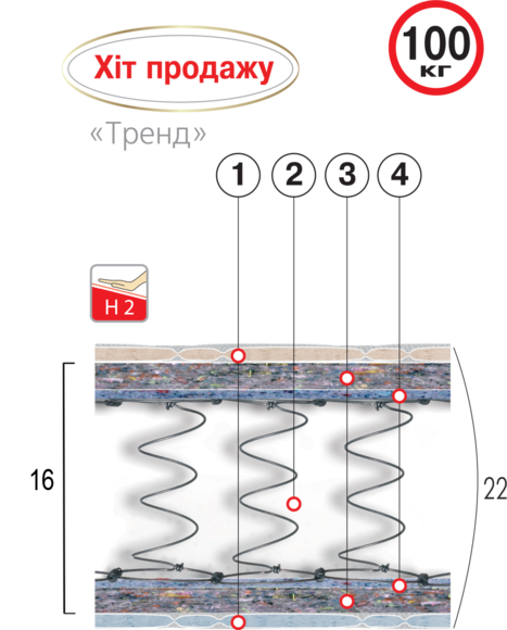 Уровень жесткости матраца H – 2 ( оценка «жесткости» разработана по 5-ти бальной системе, где 1 – мягкий, 5-жесткий матрацы);