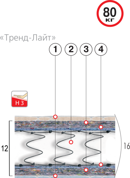 Уровень жесткости матраца H – 3 ( оценка «жесткости» разработана по 5-ти бальной системе, где 1 – мягкий, 5-жесткий матрацы);