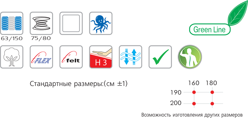 «ОНИКС». Основа одностороннего матраца - оригинальная комбинация двух пружинных блоков. Нижний блок «Bonnell» высотой 8 см обеспечивает стабильность конструкции матраца и упругую поддержку верхнего трехзонного блока «карманной» пружины, пластичная поверхность которого отвечает за ощущение комфорта.