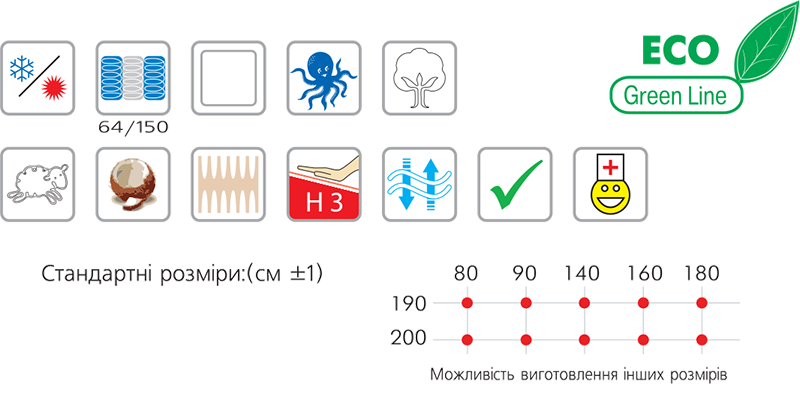 • чохол: стьобаний на об`ємному наповнювачі «Sprut» з волокнами вовни і бавовни (ефект «Зима-Літо»), основна тканина - особливий трикотаж, тканина бортової стрічки - жаккард