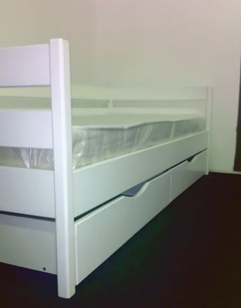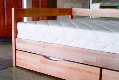 Кровать может быть укомплектована удобными вместительными ящиками для вещей(ДСП с деревянным фасадом). Ящики на роликах, без подвесных и прочих ненадежных систем выдвижения, гарантируют долгий срок эксплуатации.