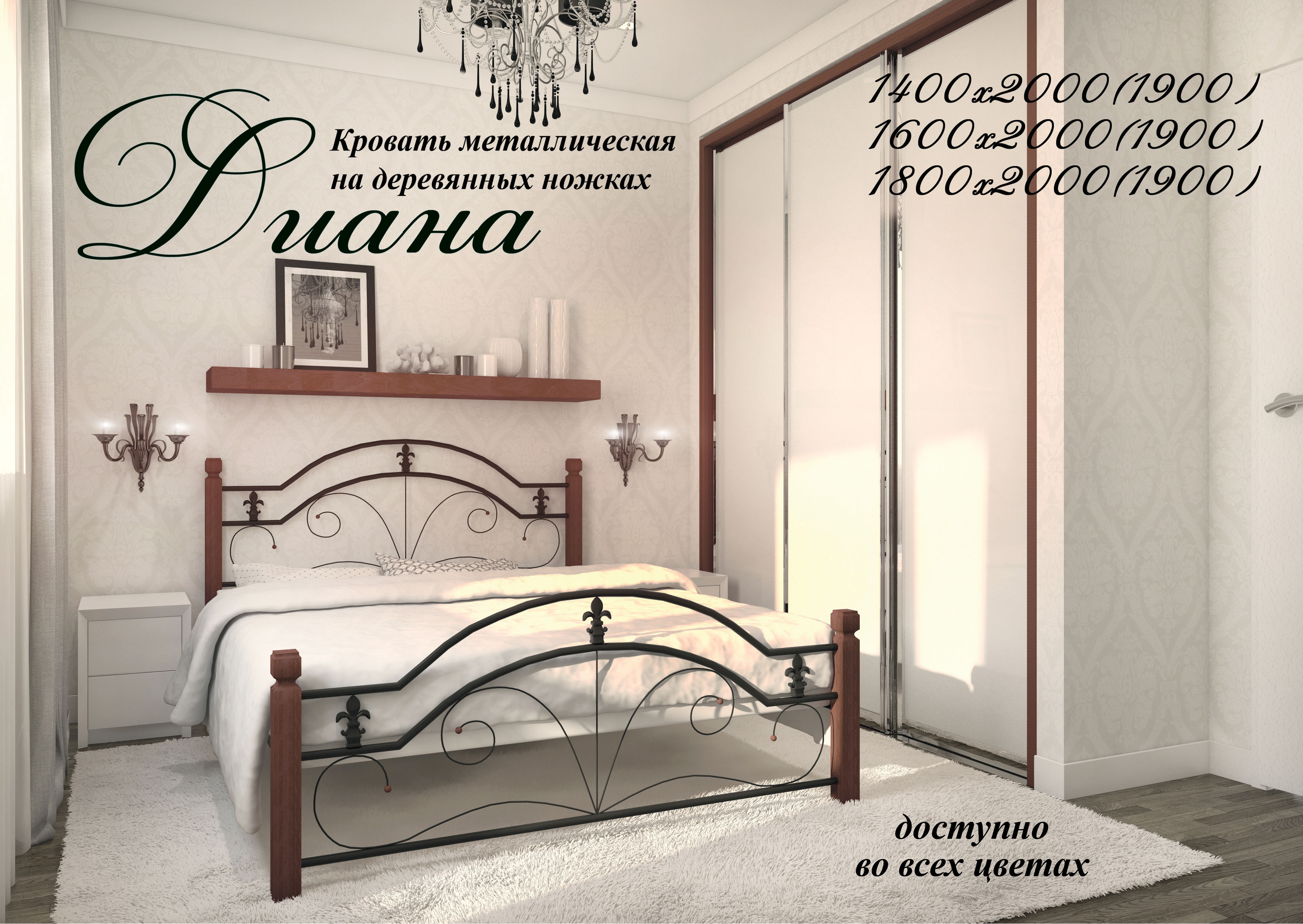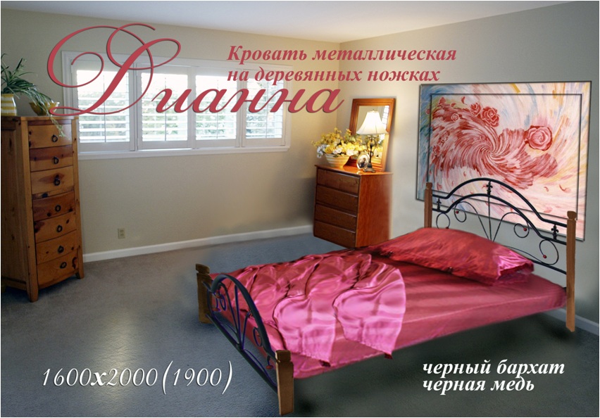 Совершенно другой облик приобретает «Диана» облачившись в более тожественный наряд из черного бархата, черной меди, белого бархата. Оттененная прелестным блеском натурального дерева она уже не вписывается во французский «Прованс», ей подойдут классические интерьеры с дорогой отделкой и лепниной, деревянной мебелью. Она более роскошна, нежели ее сестрица, модель «Диана» в металле. Королевские лилии в декоре изголовья выглядят отчетливее. Появление закрытого изножья, является еще одной отличительной чертой данной модели. Темные цвета окраски комплектуются ножками цвета яблоня, а светлые цвета окраски белыми.