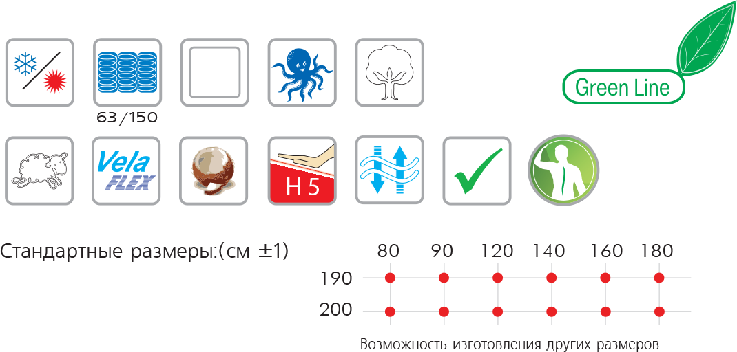 Основой матраца – служит специально разработанный специалистами компании усиленный пружинный блок «SPS» (Strengthened Pocket Spring) . Блоки изготавливаются компанией ВЕЛАМ на швейцарском оборудовании SPUHL. Настил кокосовой койры служит для распределения повышенной нагрузки. Использование материала VELAFLEX , на основе гипоалергенных и антистатических РЕТ волокон, создает повышенный воздухообмен внутри изделия, повышает качество матраца и экологию зоны отдыха. Для основных полотен чехла используется специальная трикотажная ткань Green Line