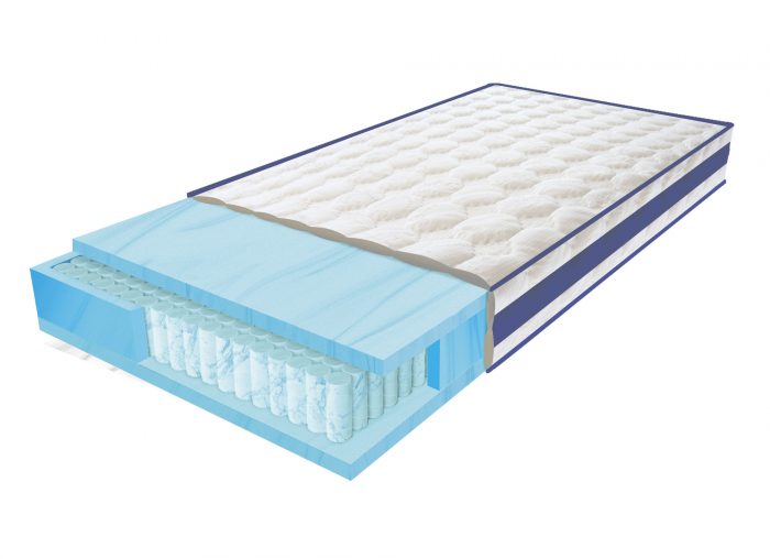 В основе матраса лежит блок независимых пружин «Pocket Spring». Преимущество такого блока пружин в том, что каждая пружина помещается в отдельный чехол из спанбонда, нагрузка распределяется по всей площади равномерно, исключается эффект «волны».