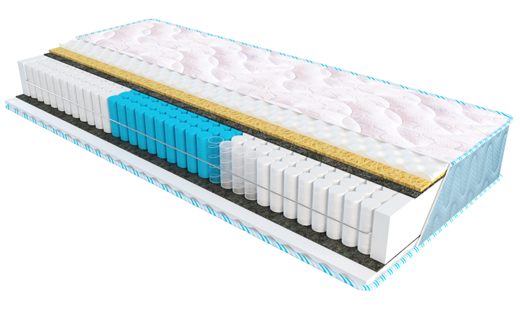Трехуровневая система независимых высоких пружин Anatomic Multy Zone 3, усиленная по периметру рамой из прокатной стали. Применение высоких пружин увеличивает степень упругости матраса, тем самым повышая эффективность поддержки тела во время сна. Зональное распределение свойств пружинного блока обеспечивает лучшую анатомическую поддержку позвоночника и расслабление мышц.