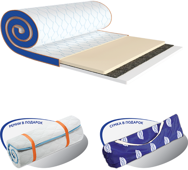 Матрас легко самостоятельно скручивать и фиксировать ремнями с "липучками" в максимально компактном виде, чтобы сэкономить место для хранения.