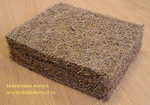 "Дедушка" материалов подобного типа - Tempur - до сих пор остается эталонным материалом с эффектом памяти. Темпур применяется в подушках и матрасах, правда матрасы с Темпуром весьма недешевы. В отличие он многих аналогов, Темпур обладает феноменальной вязкостью, он самый "пластилиновый" из всех подобных материалов. - Кокосовая койра - жесткий, хорошо вентилируемый наполнитель. Изготавливается из волокна кокосовой пальмы, поставляется в виде плит высотой 1-3 см. Обычно пропитан латексом, но встречается и без пропитки, иглопробивной (последний подобен спрессованному сену, менее долговечный).