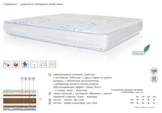 Специалисты фирмы решили не игнорировать многочисленные просьбы предложить более жесткую модель матраца. Так появилась модель «Пармезан». Однако даже эту модель мы укомплектовали настилами из латекса, так как серьезно относимся к вопросу Вашего здоровья.